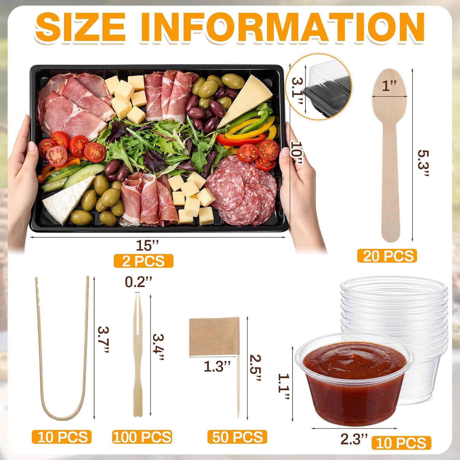 Features: This versatile deli accessory set makes parties more enjoyable and its size suitable for a party platters, it makes a gift for family and friends. If you enjoy making party platters, then this is a practical, beautiful, and fully functional charcuterie board accessory set Specifications: Material: plastic, wood Color: black, clear, kraft paper color Size: Plastic food container: about 14.96 x 10 x 3.15 inch/ 38 x 25.4 x 8 cm Sauce cup: about 2 oz/ 60 ml Fruit fork: about 0.28 x 3.46 inch/ 0.7 x 8.8 cm Wooden spoon: about 5.51 inch/ 14 cm Bamboo tongs: about 3.94 inch/ 10 cm Package includes: 2 x Plastic food containers 10 x Sauce cups 100 x Fruit forks 20 x Wooden spoons 50 x Toothpick flags 10 x Bamboo tongs Notes: Manual measurement, please allow slight errors on size. The color may exist a slight difference due to different screen displays